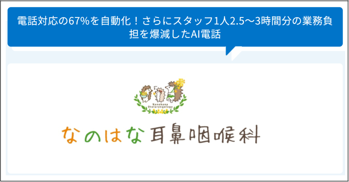 AI電話自動応答サービスを導入している茨城県水戸市の「なのはな耳鼻咽喉科(http://nanohana-jibika.com/)」では、月間1,138件あった着信のうち、AIがそのうち約67.4%にあたる768件を対応。「朝、あれだけ鳴っていた電話が、午後には1件も鳴らなかった日があった」と話すほど、体感としてとても大きな変化がありました。