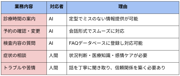 つまり、「AIか人間か」ではなく、「どの業務を誰が担当するか」を考えることが、現場の生産性と患者満足度を高める鍵になります。