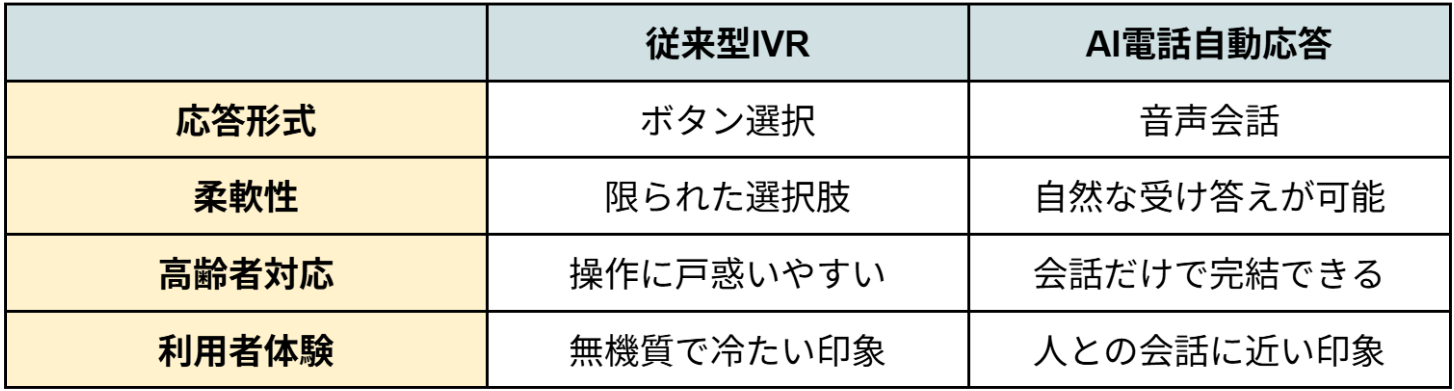 電話自動応答と聞くと、多くの方が従来の「IVR(自動音声応答)」を思い浮かべるかもしれません。IVRは 「1番を押してください」「もう一度お願いします」といった、機械的な案内です。
