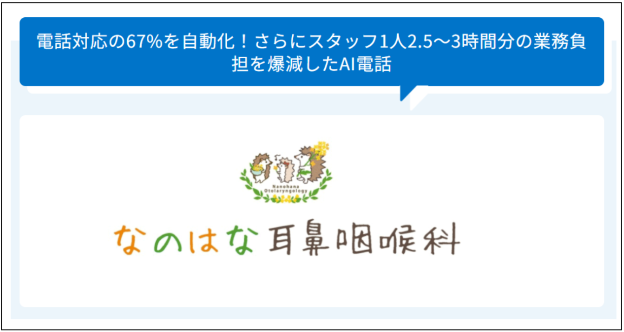 AI電話自動応答サービスを導入している茨城県水戸市の「なのはな耳鼻咽喉科(http://nanohana-jibika.com/)」では、月間1,138件あった着信のうち、AIがそのうち約67.4%にあたる768件を対応。「朝、あれだけ鳴っていた電話が、午後には1件も鳴らなかった日があった」と話すほど、体感としてとても大きな変化がありました。