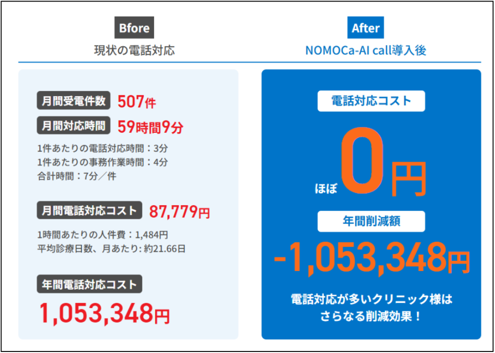 NOMOCa-AI callの導入により、月間59時間分の電話対応がゼロに近づき、年間約105万円の人件費削減につながった事例があります。※