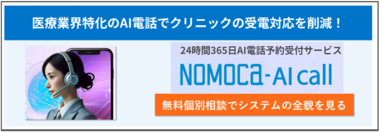 会話ベースの応答は、感情的にも「冷たくない対応」を実現し、クリニックのホスピタリティ向上にもつながります。その代表例が「NOMOCa-AI call」で、会話の滑らかさと温かみのある応答が大きな特長です。