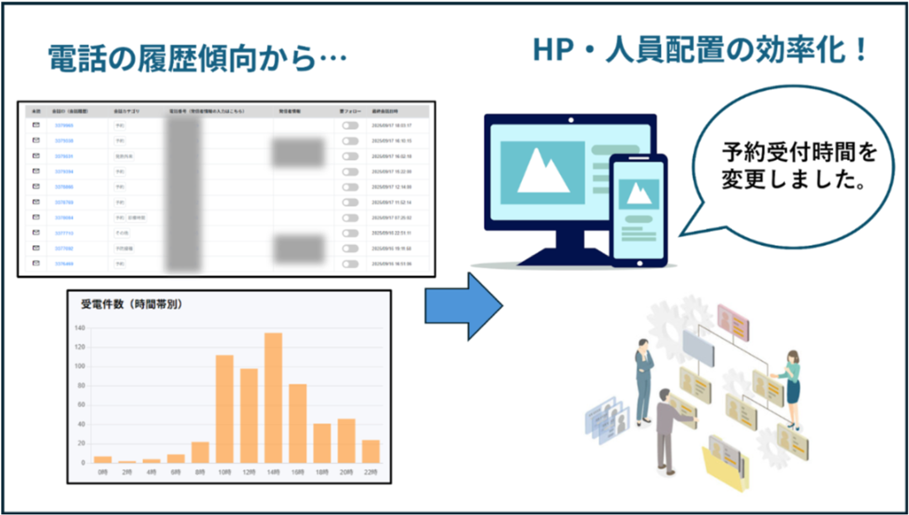 | データ活用による業務改善 | 問い合わせ内容の可視化 | クリニックの業務改善 |