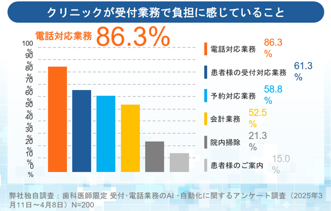 自社で実施した調査では、約86.3%のクリニックが電話対応業務に大きな負担を感じているという結果が出ています。つまり、多くの現場で電話が業務設計そのものを左右している実態があるのです。