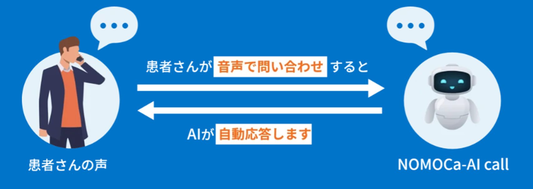 NOMOCa-AI callは、クリニック向けに設計されたAI電話自動応答サービスです。患者さんが普通に話しかけるだけで会話が成立する、自然な音声対応が特徴です。