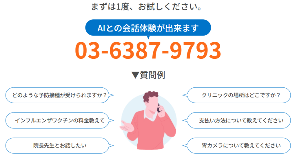 番号を押す必要はなく、診療時間や休診日の確認、予約に関する案内など、よくある問い合わせにはAIが自動で対応します。