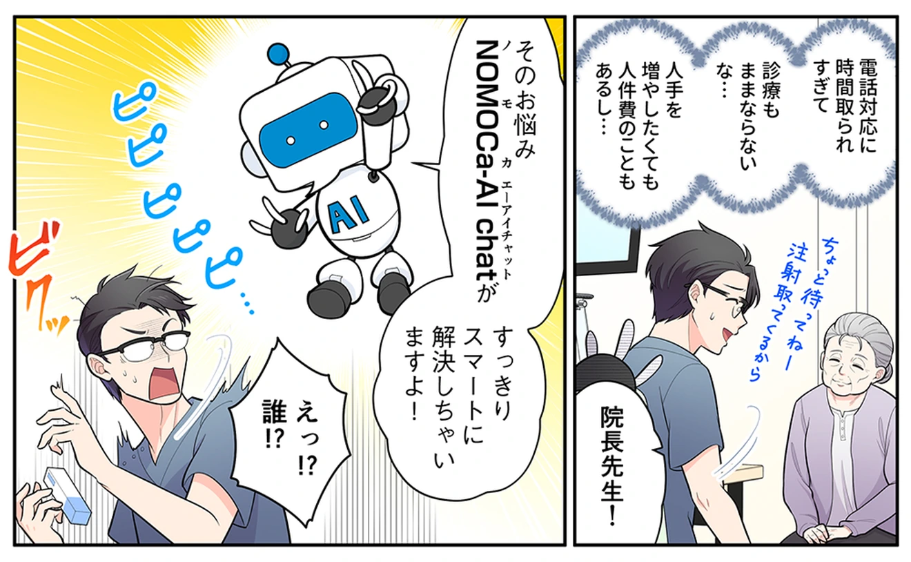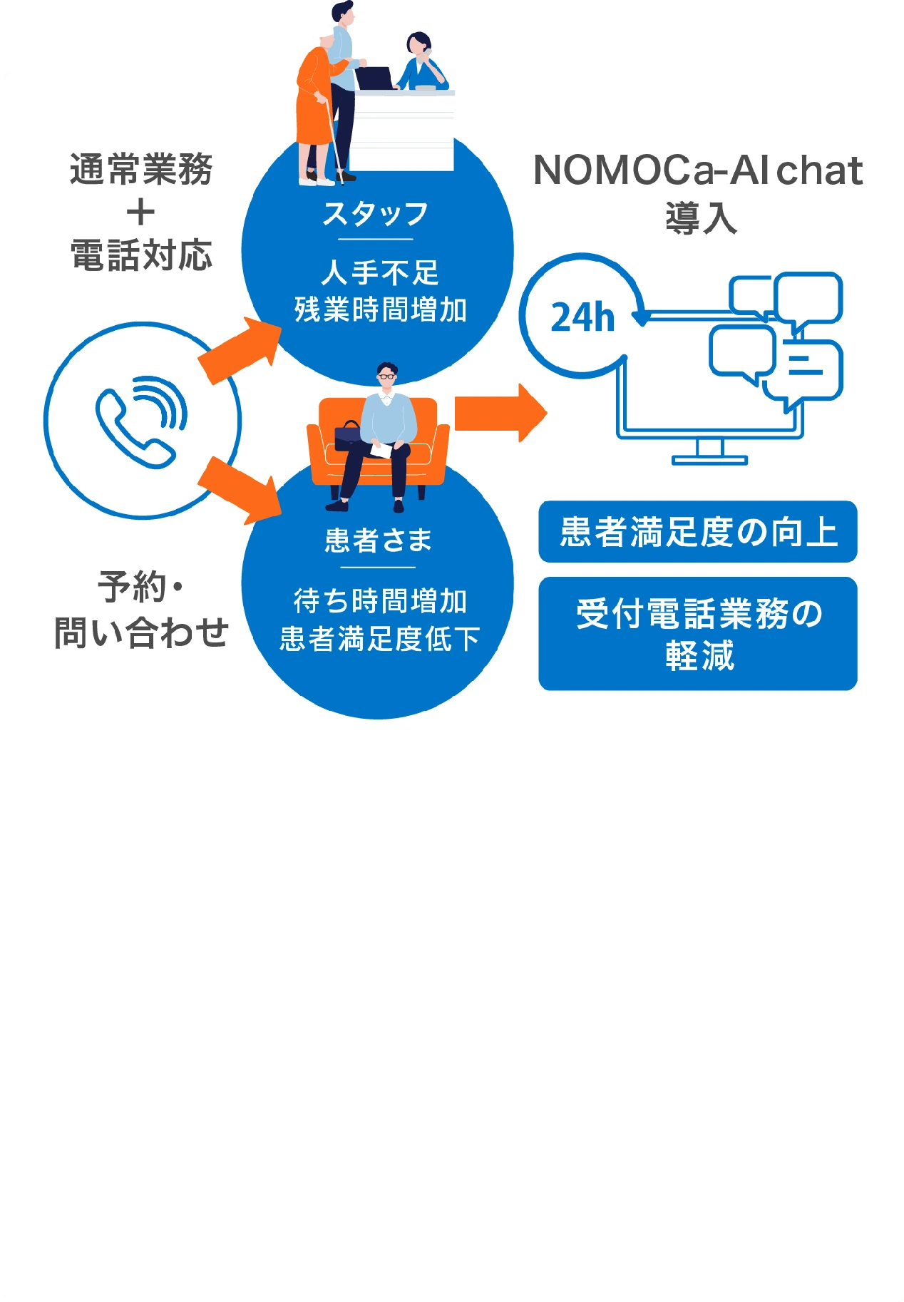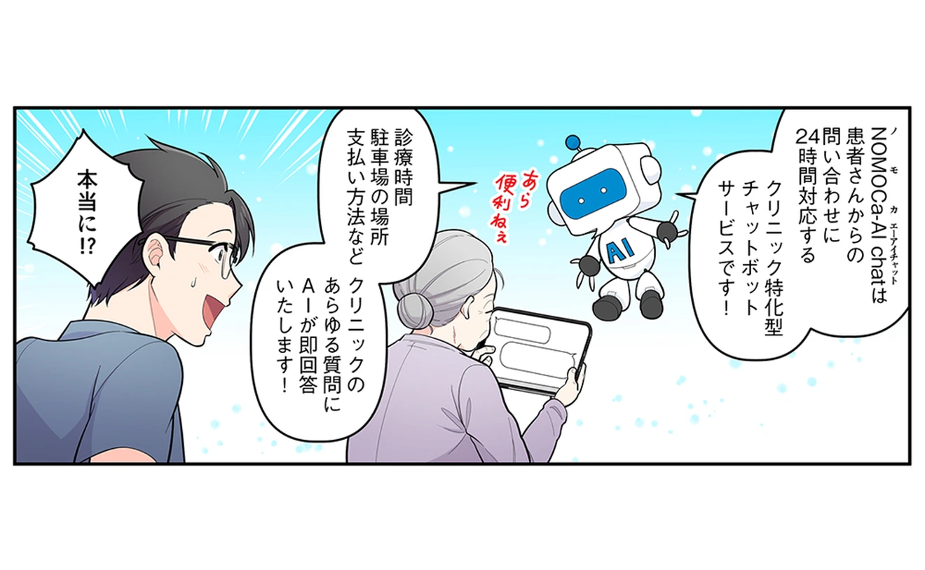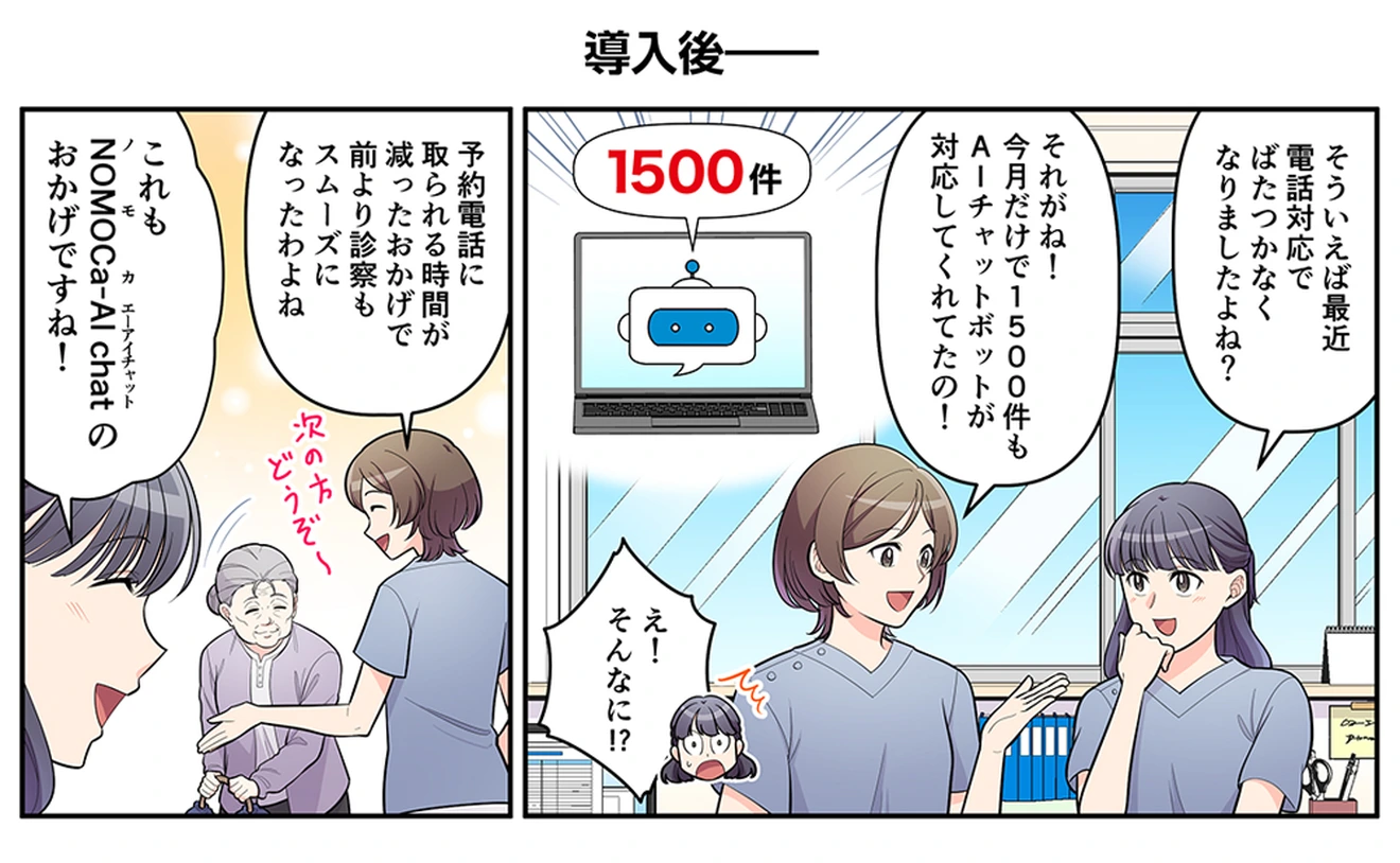 NOMOCa-AI chatは、クリニック専用のチャットボットが独自のFAQを学習し、精度の高い回答で受付の電話業務を軽減させます。スタッフは本来の業務に専念できますので、患者満足度の向上につながります。