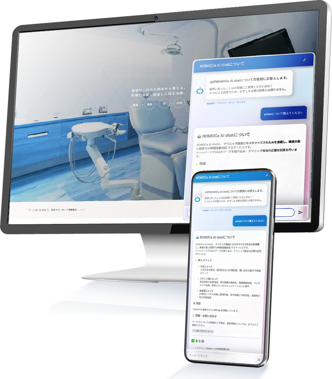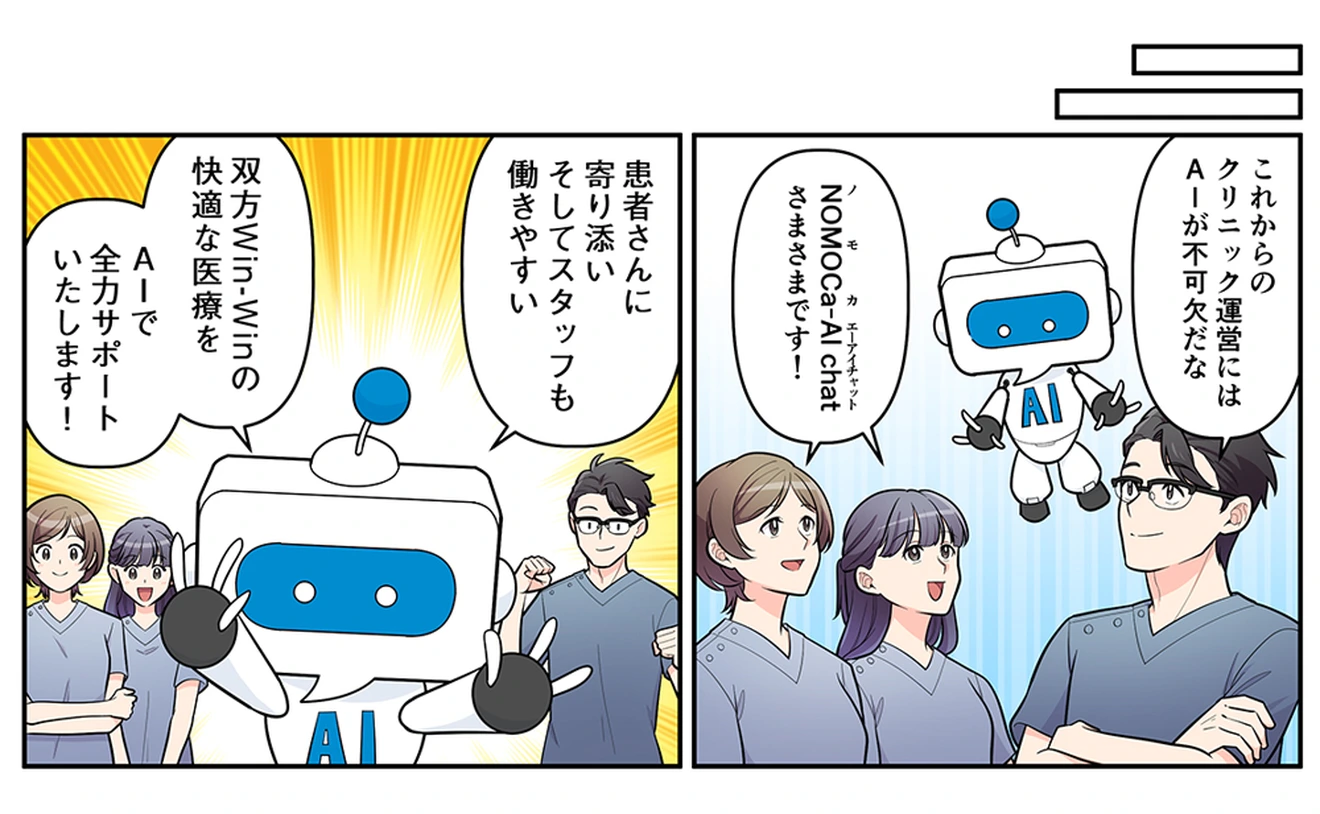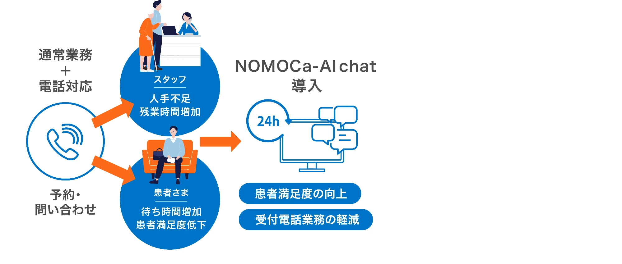 NOMOCa-AI chatは、クリニック専用のチャットボットが独自のFAQを学習し、精度の高い回答で受付の電話業務を軽減させます。スタッフは本来の業務に専念できますので、患者満足度の向上につながります。