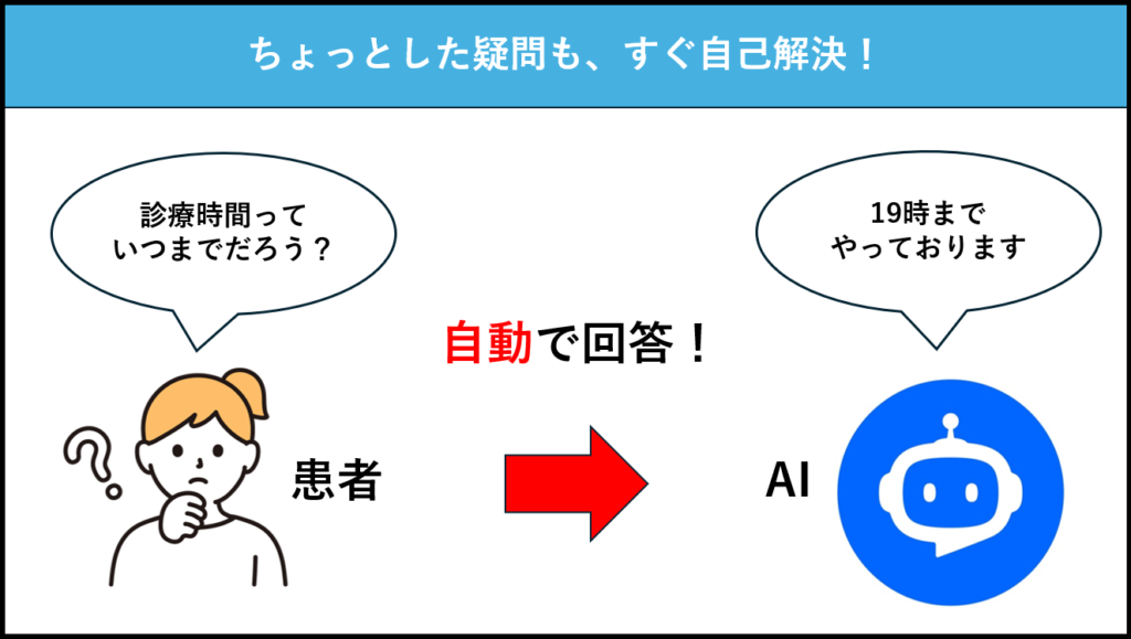 診療時間外であっても患者との接点を持ち続けられるため、「聞きたいことはあるけれど、今は電話できない」「確認できないまま予約を見送ってしまう」といったケースを防ぎやすくなり、結果として予約につながる機会を逃しにくくなります。